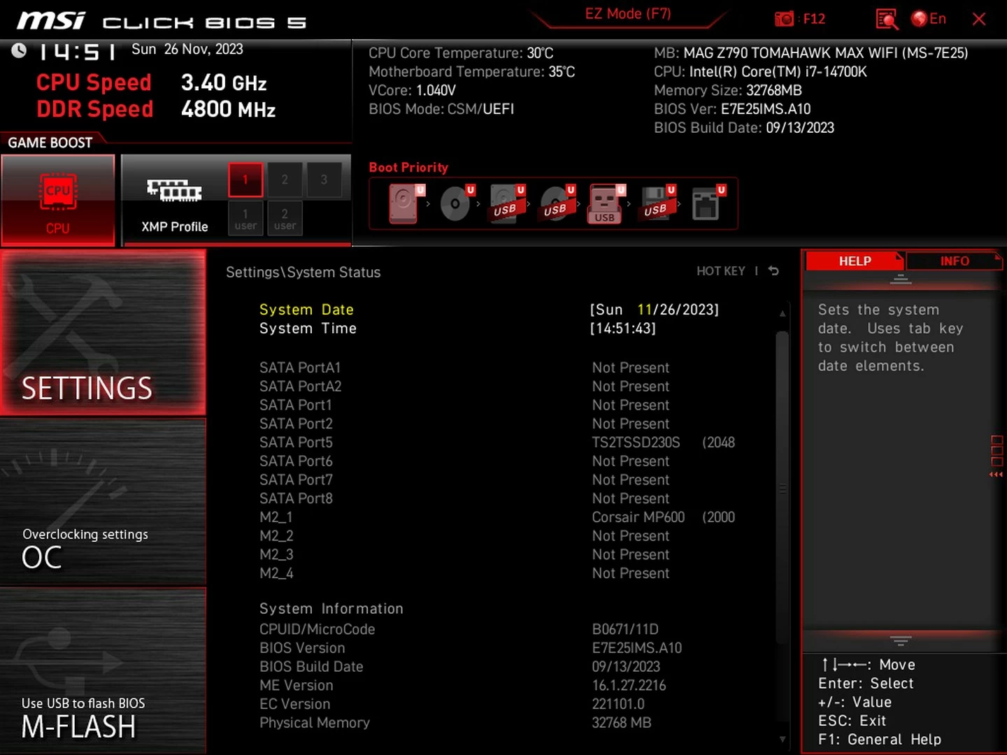عند الدخول إلى شاشة الخيارات الرئيسية فإن أول ما ستجده أمامك هو خيارات حالة النظام أو System status، والتي بداخلها سنجد خيارات مثل ضبط الوقت والتاريخ، عرض وحدات التخزين الموجودة سواء الموجودة على منافذ Sata أو M.2، كما سنرى أيضاً بعض المعلومات الأساسية الخاصة بالمنصّة مثل حجم الرامات وترددها، ونسخة البيوس المُثبّتة وغير ذلك.