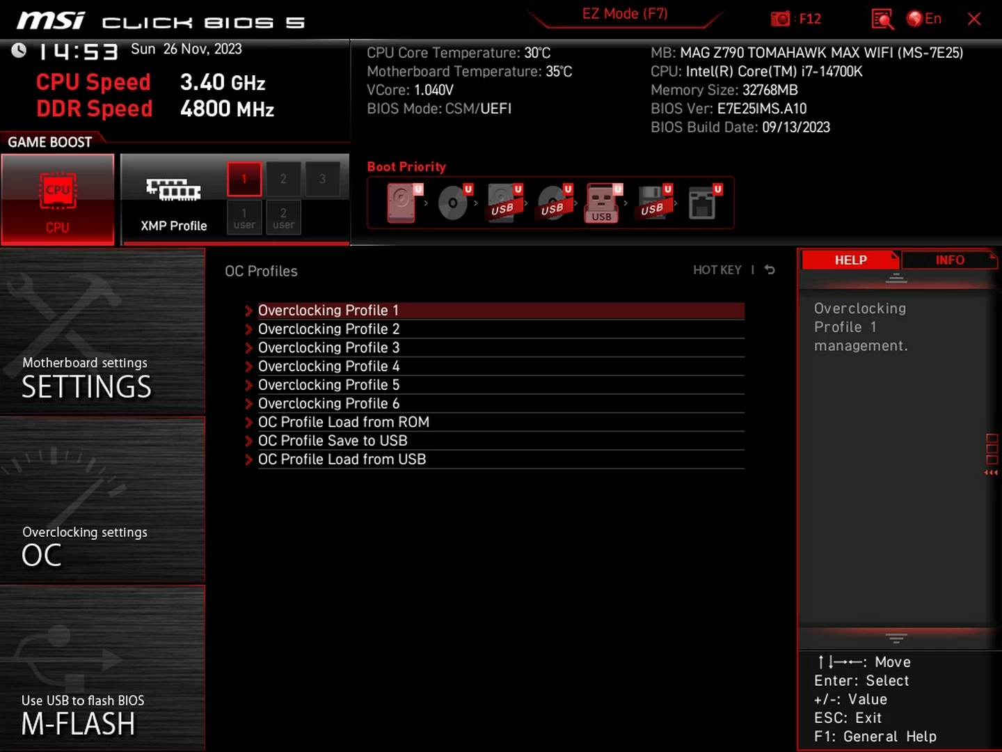 بالرجوع إلى شاشة البيوس الرئيسية، هناك أيضاً سنجد خيار اختيار ملف كسر السرعة المرغوب فيه. وهنا يُمكنك تسجيل ملفّات وإعدادات كسر السرعة السابقة، والرجوع إليها وقت الحاجة. ثم هناك أيضاً خيار M-Flash الذي يسمح لك بالتعامل مع عملية تحديث البيوس بشكلٍ آمن. وأخيراً خيارات المراقبة التي ستجدها داخل تبويب Hardware Monitoring.