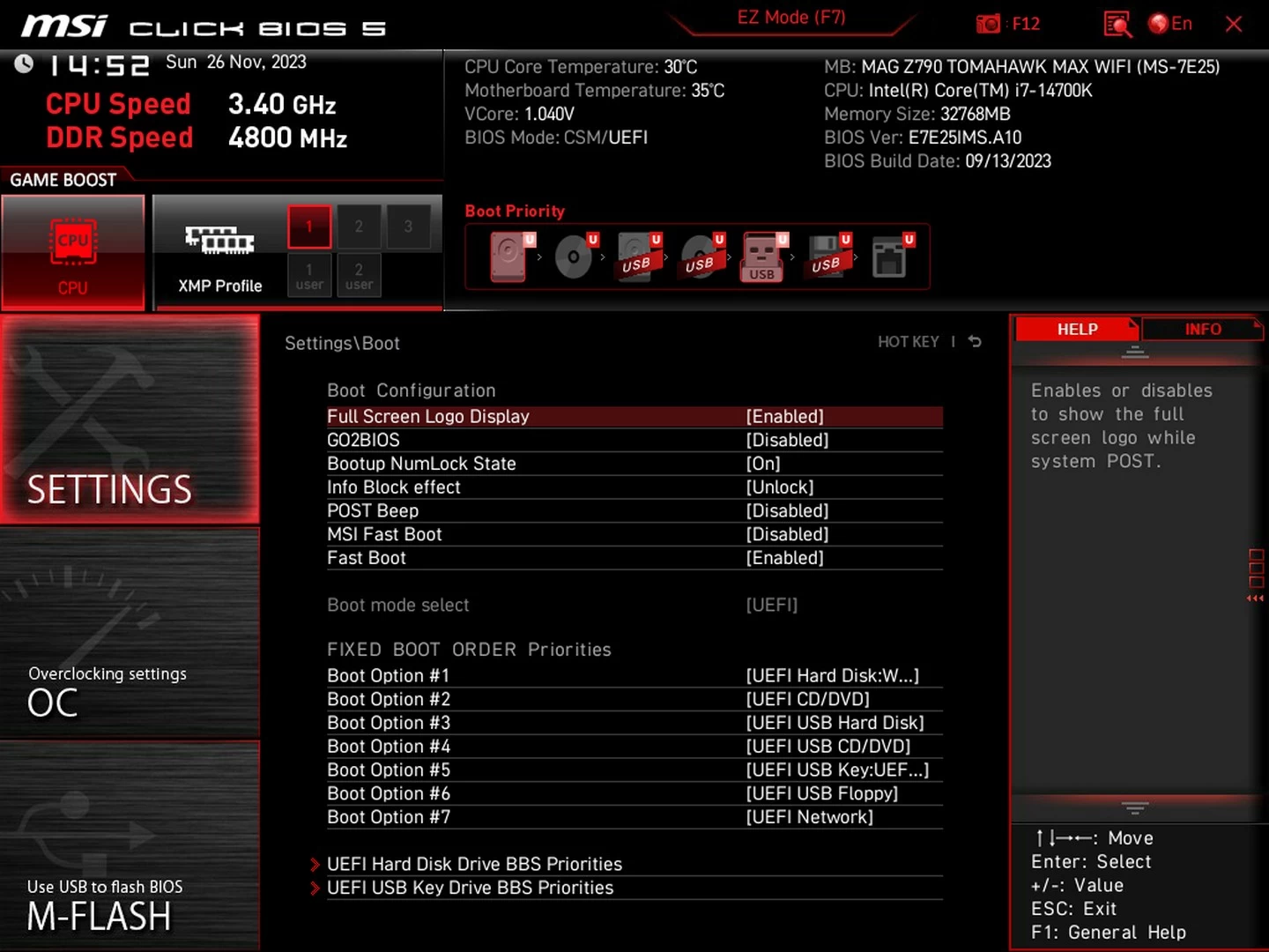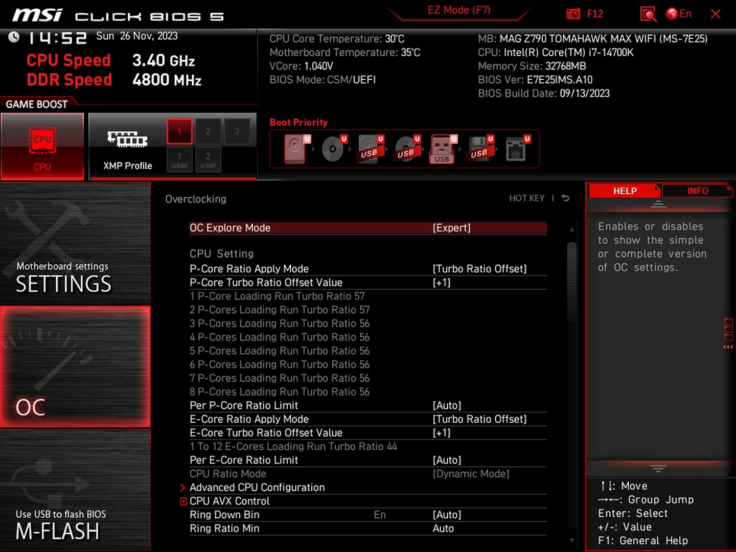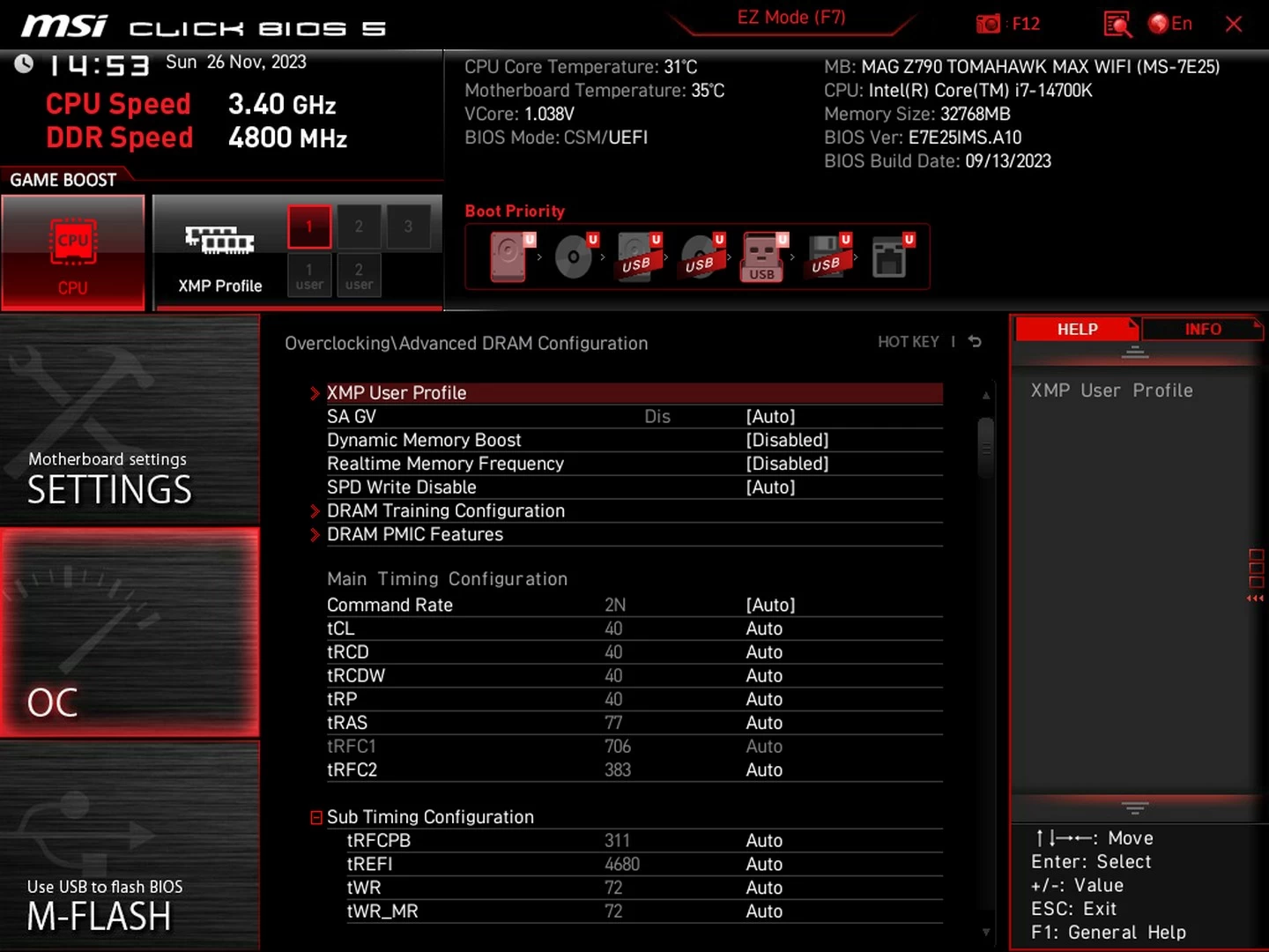الشاشة الأساسية للوضع المُتقدّم كما نرى تضع أمامك العديد من الأمور، بداية من الجزء العلوي الذي سنجد فيه المعلومات العامة عن النظام، مثل اللوحة الأم ونسخة البيوس المُستخدم، المعالج، الرامات. وما يخص كل منها من معلومات مثل الترددات، درجات الحرارة وما إلى ذلك. لدينا أيضاً القدرة على تحديد أولولية التشغيل Boot priority التي ستوفّر لك القدرة على تحديد الأجهزة التي يُشغّل منها جهازك نظام التشغيل، هذا بالطبع إلى جانب القدرة على تشغيل ملفّات XMP من الجانب الأيسر.