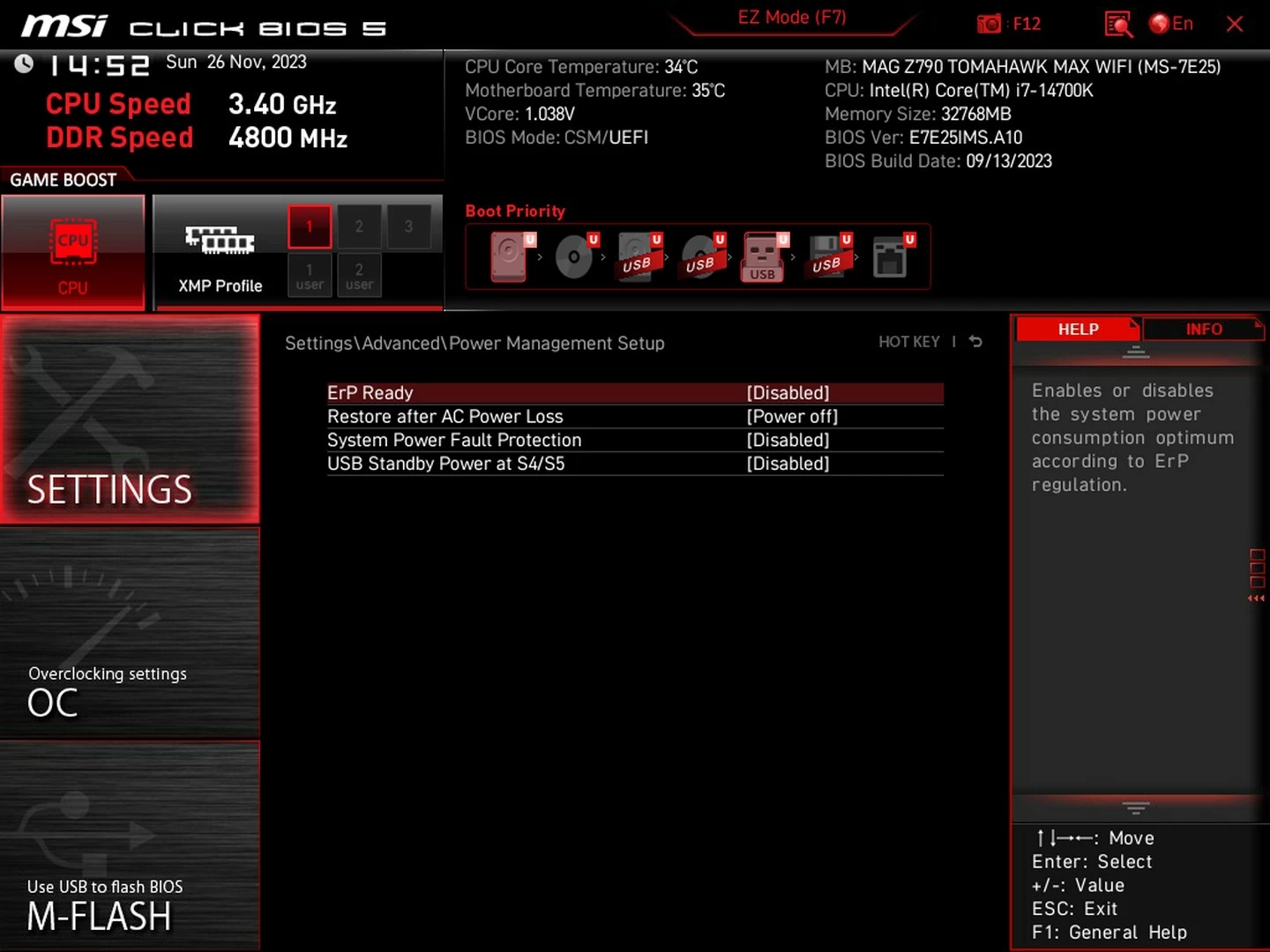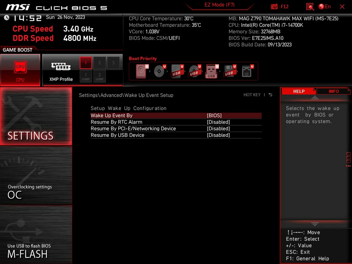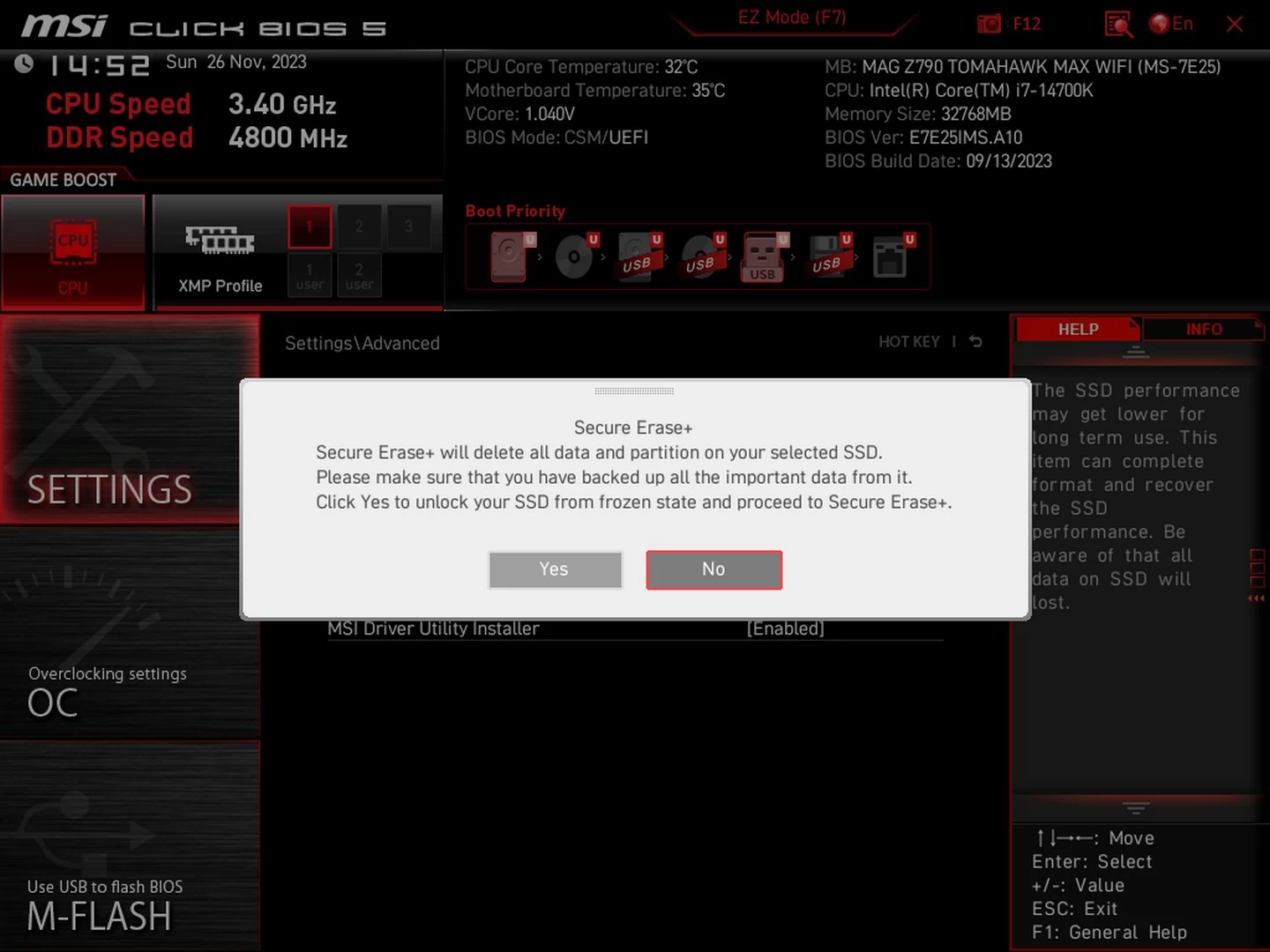بعد ذلك هناك بعض الخيارات الأُخرى مثل نظام البيوس المُستخدم، خيارات الطاقة المُختلفة، وخيارات الإيقاظ وميزة secure Erase+ التي توفّر لك القدرة على إزالة ومسح البيانات من وحدات التخزين الخاصة بك.