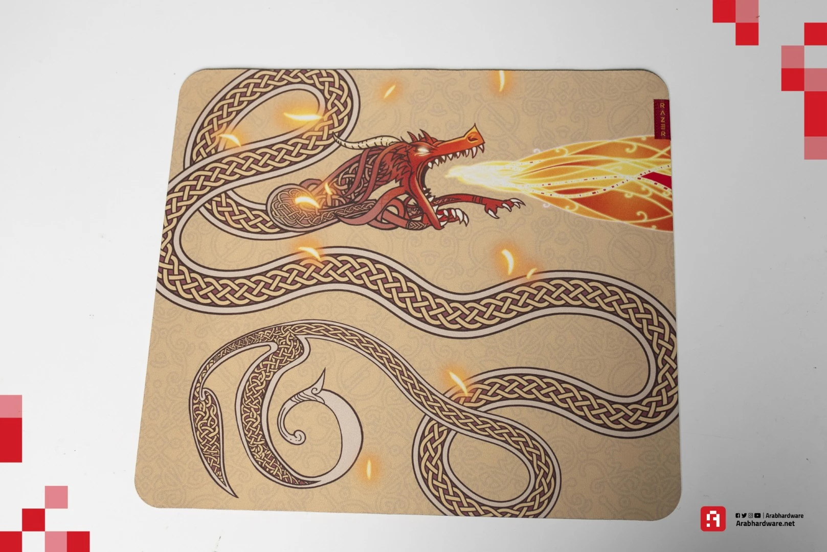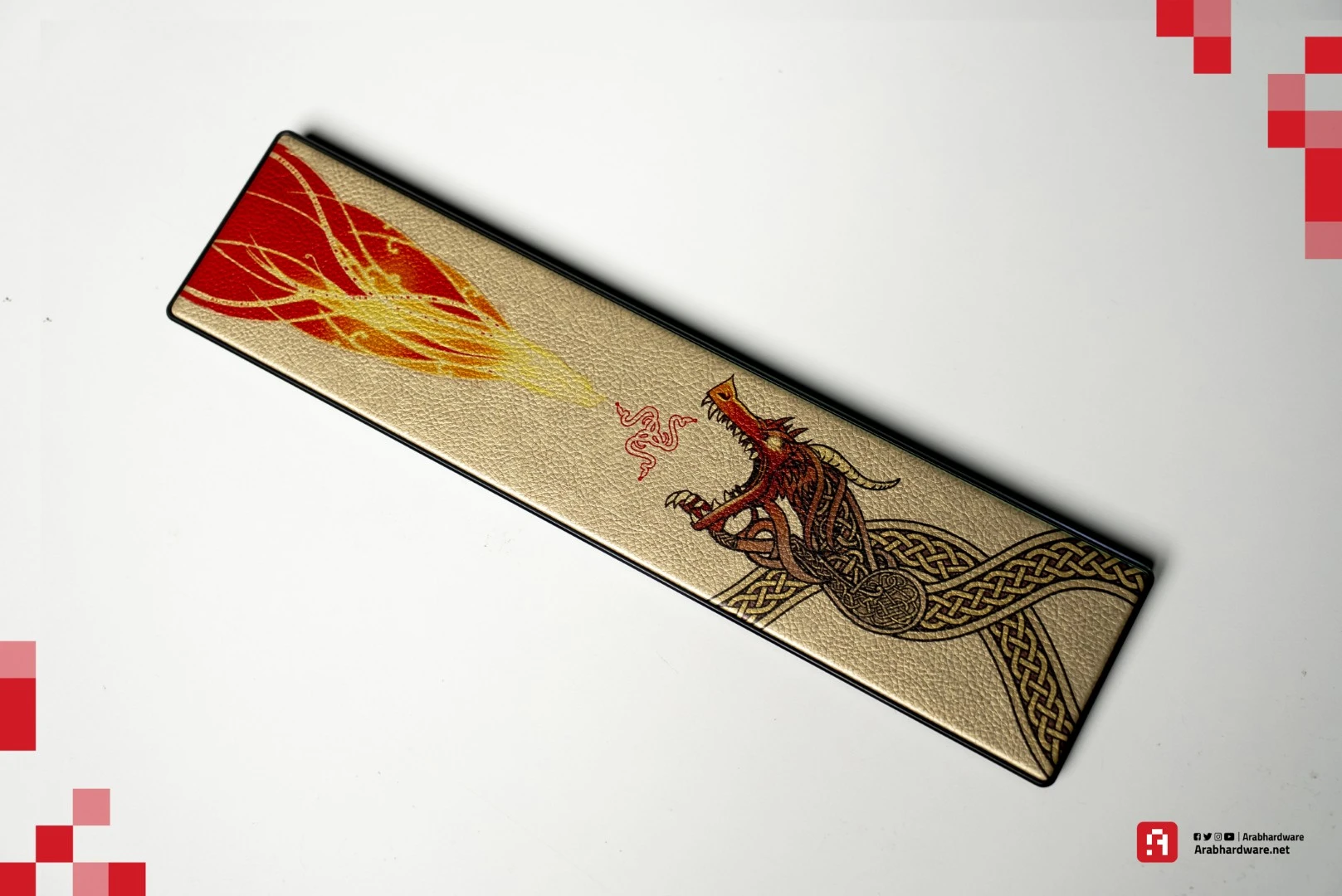 عندما جربنا فتح علب المنتجات لاحظنا أنها مغطاة بالكامل بنقوش Dragon Lore الشهيرة - وهو التنين الذي ينفث النيران باللون الزيتوني والذهبي والأحمر- مما يجعل الصندوق بحد ذاته قطعة فنية تصلح للعرض على رف سطح المكتب. تحتوي العلب على ملصقات، لكن بدلاً من ملصقات Razer الخضراء المعتادة، ستجد ملصقات حصرية تحمل شعار Counter-Strike 2 وشعار Razer بألوان ذهبية وحمراء تتناسب مع تصميم المجموعة.