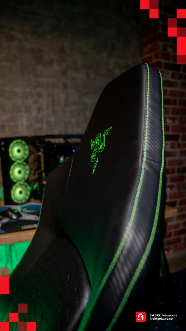 إنتهت مرحلة التركيب سريعًا، وعند النظر على الكرسي من بعيد نرى أن لمسة Razer فيه ليست عنيفة بالشكل المتوقع. الكرسي لونه أسود بالكامل، ولكن فيه لمسات خضراء تجعل شكله أكثر أناقة بدون تغيير لون جزء كبير من الكرسي نفسه، والميزة الأخرى أنه لا يوجد إضاءة RGB في الكرسي.