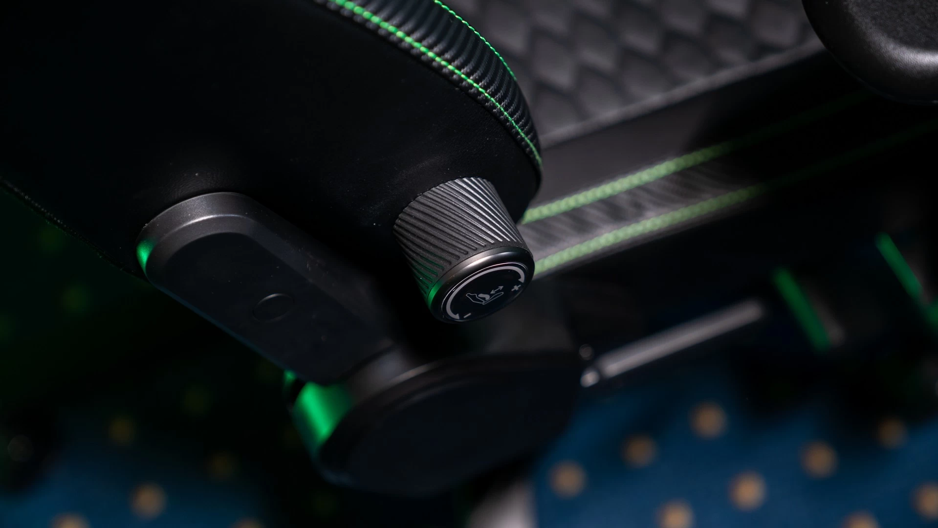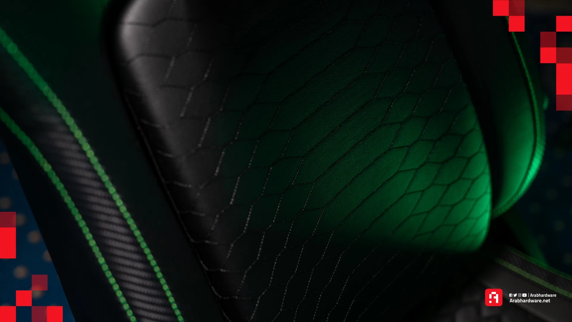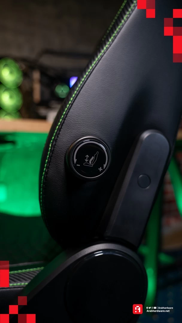 شعار Razer يزين الكرسي خلف الرأس، وهناك وسادة يمكنك أن توضعها. الوسادة سوداء أيضًا، وشعار Razer يزينها هو الآخر. لحسن الحظ، لا توجد فتحات وراء الرأس مثل الكثير من الكراسي في السوق، لأنها، وببساطة، لا تضيف أي شيء للمستخدم.