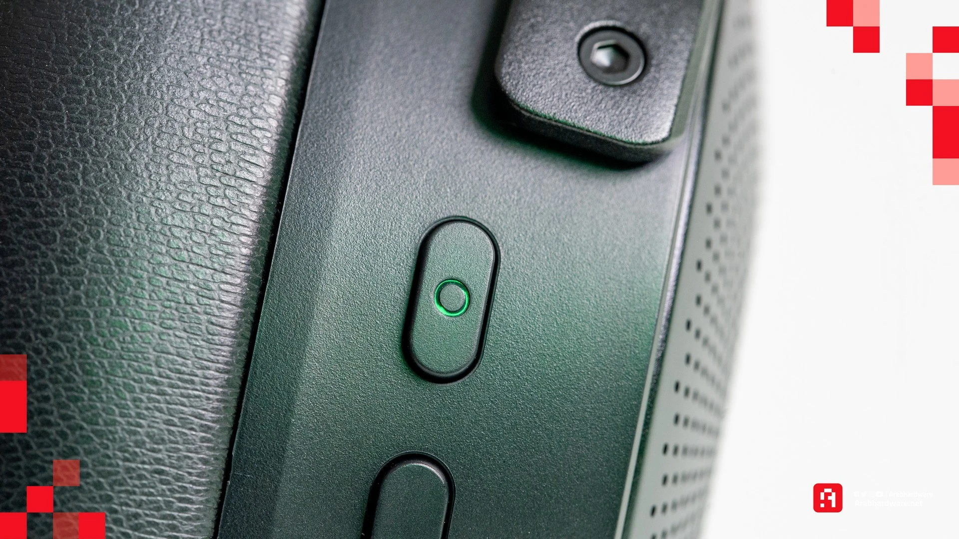 في المُقابل، تحتوي أكواب الأُذن اليُسرى مع مجموعة أكبر من الأزرار. بدايةً من زر كتم الميكروفون الذي نجده في الأعلى، تليه بكرة التحكّم في الصوت، ثم زر تشغيل وإيقاف السماعة، وأخيرًا منفذ USB-C. أسفل كل هذا هناك أيضًا فتحة كبيرة بعض الشيء في جسم السماعة، التي تُمكّنك من سحب المايكروفون المُدمج إلى الخارج. حيث تتمتّع السماعة بنظام مُختلف لإخفاء المايكروفون، على نقيض السماعات الأُخرى التي يأتي معها الميكروفون قابل للفصل.