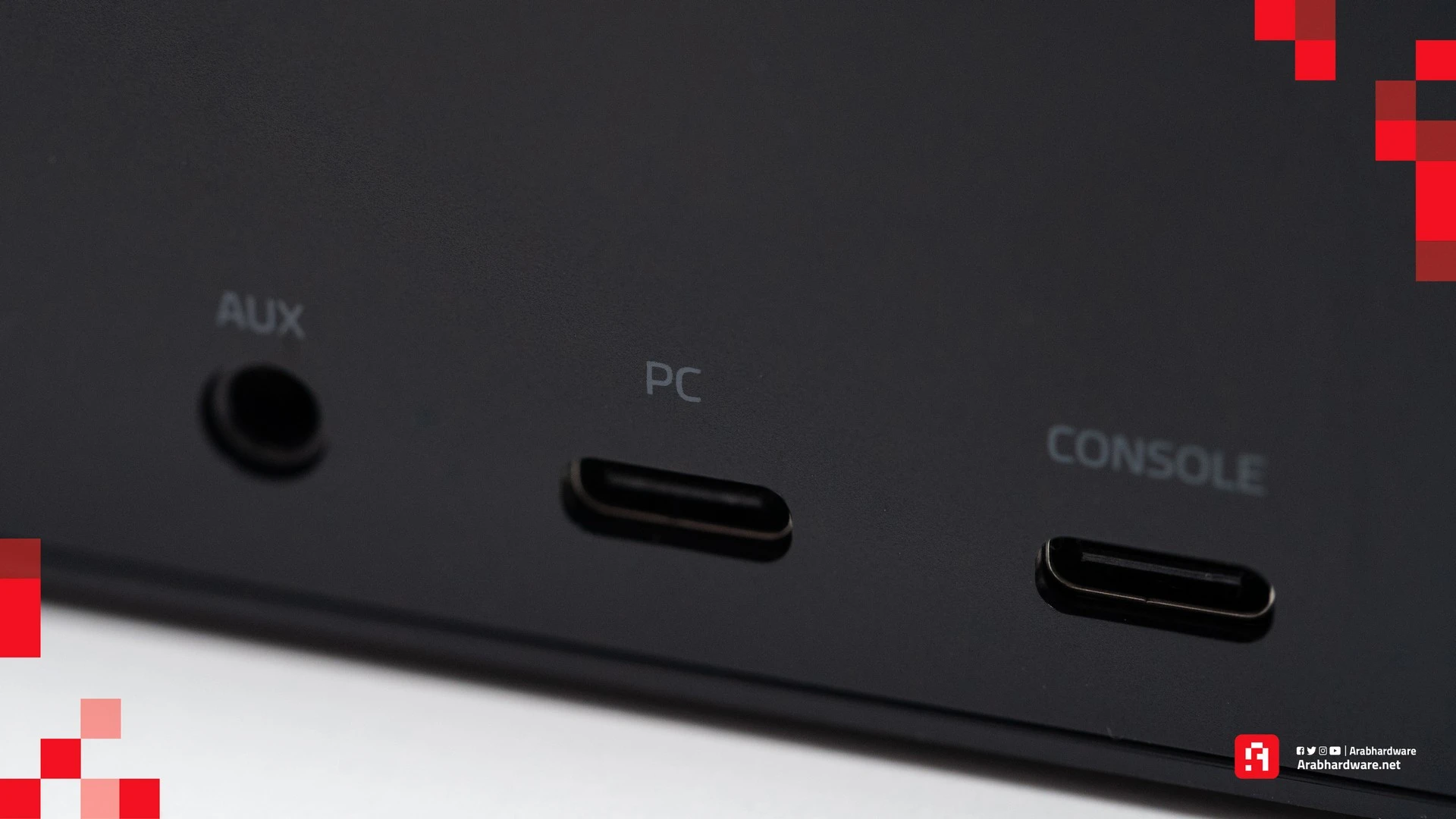 أمّا الجانب الخلفي من جهاز التحكّم فتوجد به منافذ التوصيل الثلاثة (منفذ USB-C الخاص بالتوصيل بالكمبيوتر، ومنفذ USB-C الخاص بوحدات الألعاب المنزلية، ومنفذ AUX الأخير الخاص بباقي الأجهزة الداعمة له).