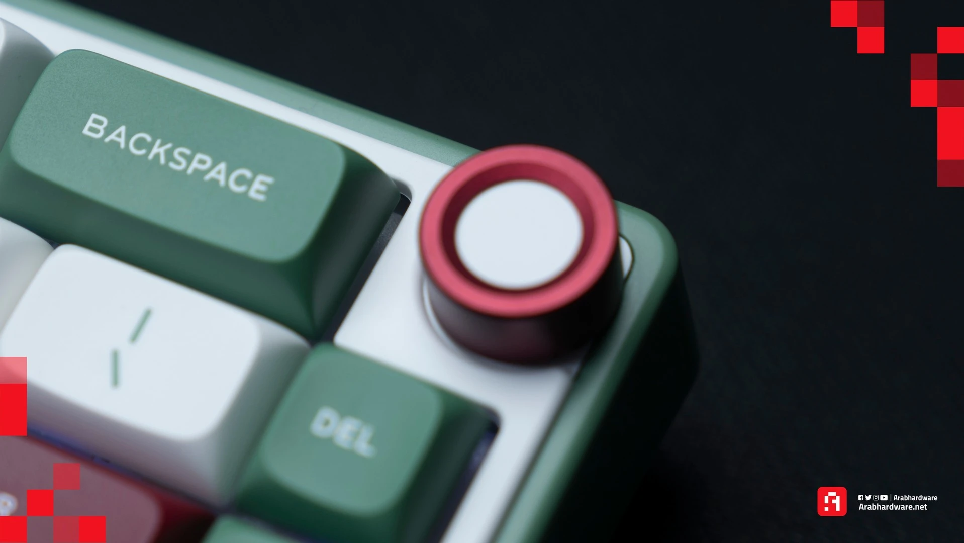 على الجانب العُلوي الأيمن من الكيبورد توجد قطعة جميلة ومُفيدة للغاية، وأصبحنا نراها كثيراً في وحدات الكيبورد في الفترة الأخيرة. هذه القطعة هي مقبض التحكّم في الصوت، والتي تتمتّع بإضاءة خلفية أيضاً كما هو الحال مع مفاتيح الكيبورد جميعها. يأتي هذا المقبض بتصميم معدني من الألومنيوم عالي الجودة، والمُصمّم باستخدام عملية تصنيع CNC. يمكنك ضبط مستوى صوت الجهاز بسرعة عن طريق تدوير المقبض، أو الضغط على المقبض لتشغيل/إيقاف الصوت. وبالتحرّك قليلاً إلى الأسفل، وتحديداً إلى جوار مفاتيح الأسهم لتجد أمامك ثلاثة مصابيح مؤشر، والتي يمكنها توضيح حالة لوحة المفاتيح بشكل سريع.