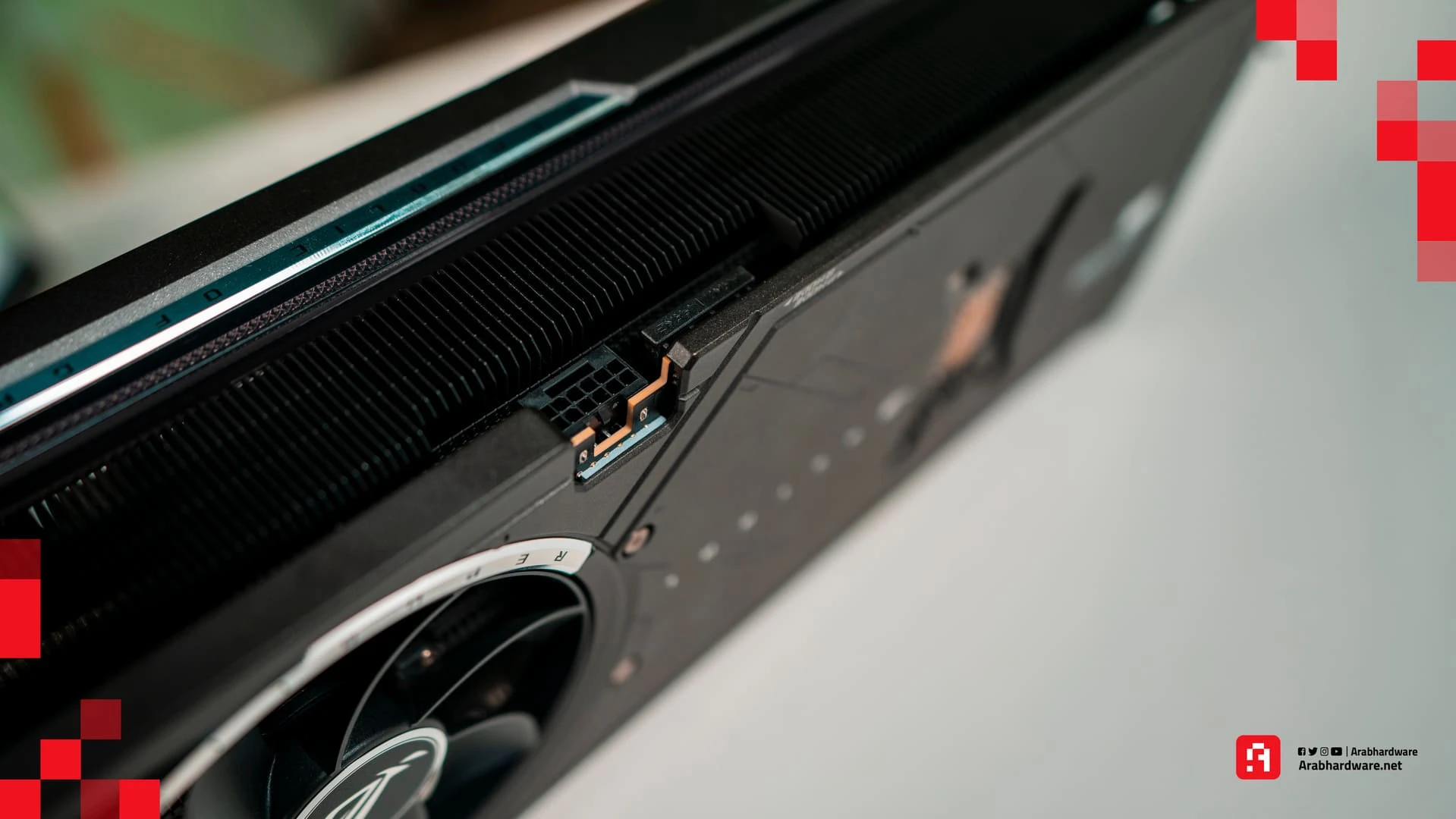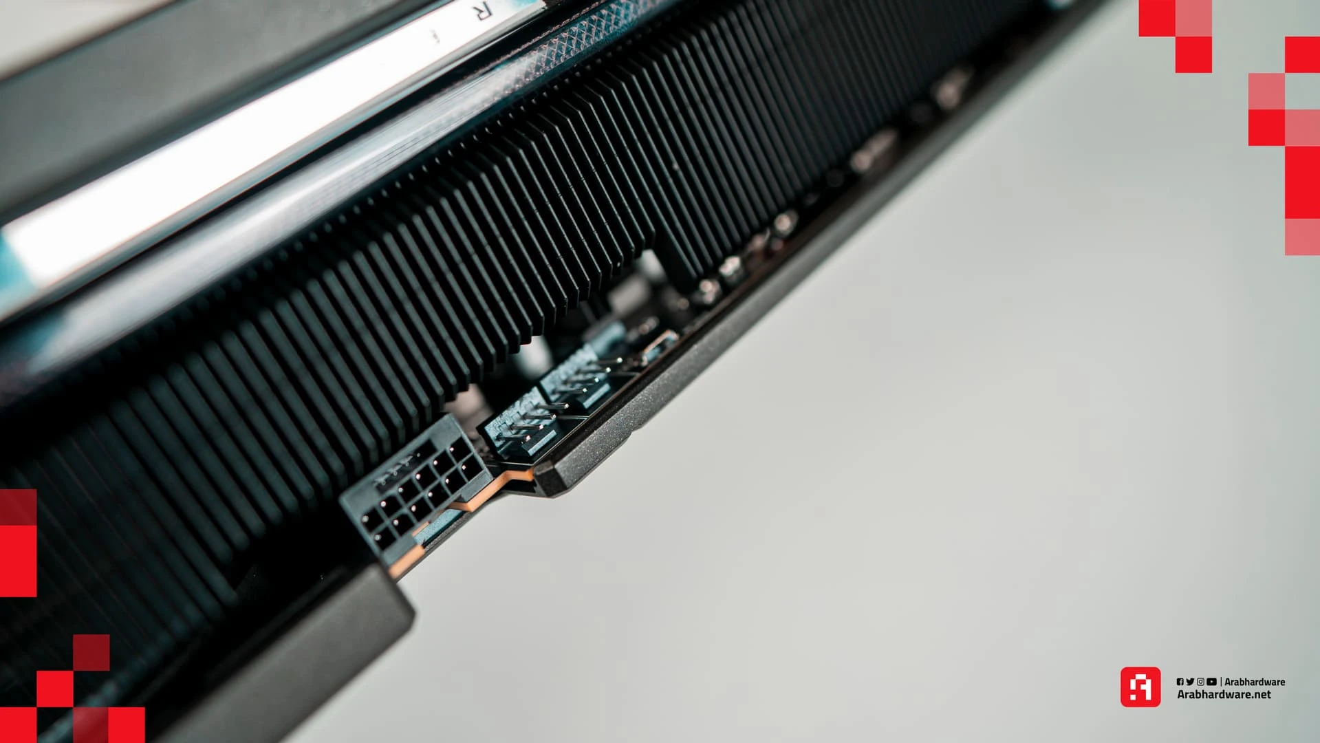 في الجهة الأمامية من الكارت، نجد أمامنا مراوح التبريد الأساسية الثلاثة. أما في الخلف، لدينا لوحة خلفية معدنية لتوفير المزيد من التبريد والحماية للكارت، بفتحة لتدفق الهواء من خلالها ومروحة رابعة لتحريك الهواء الإضافي.