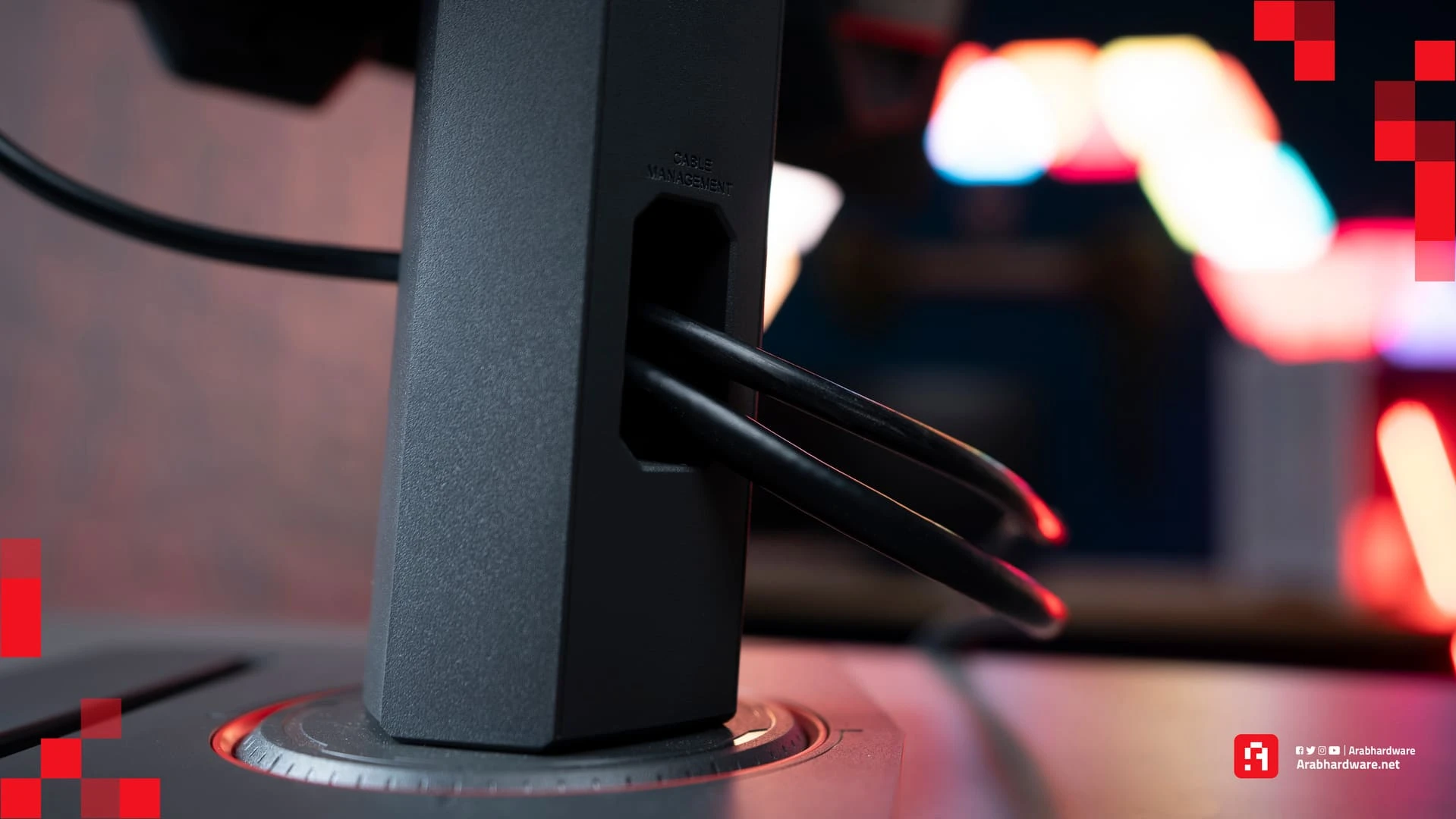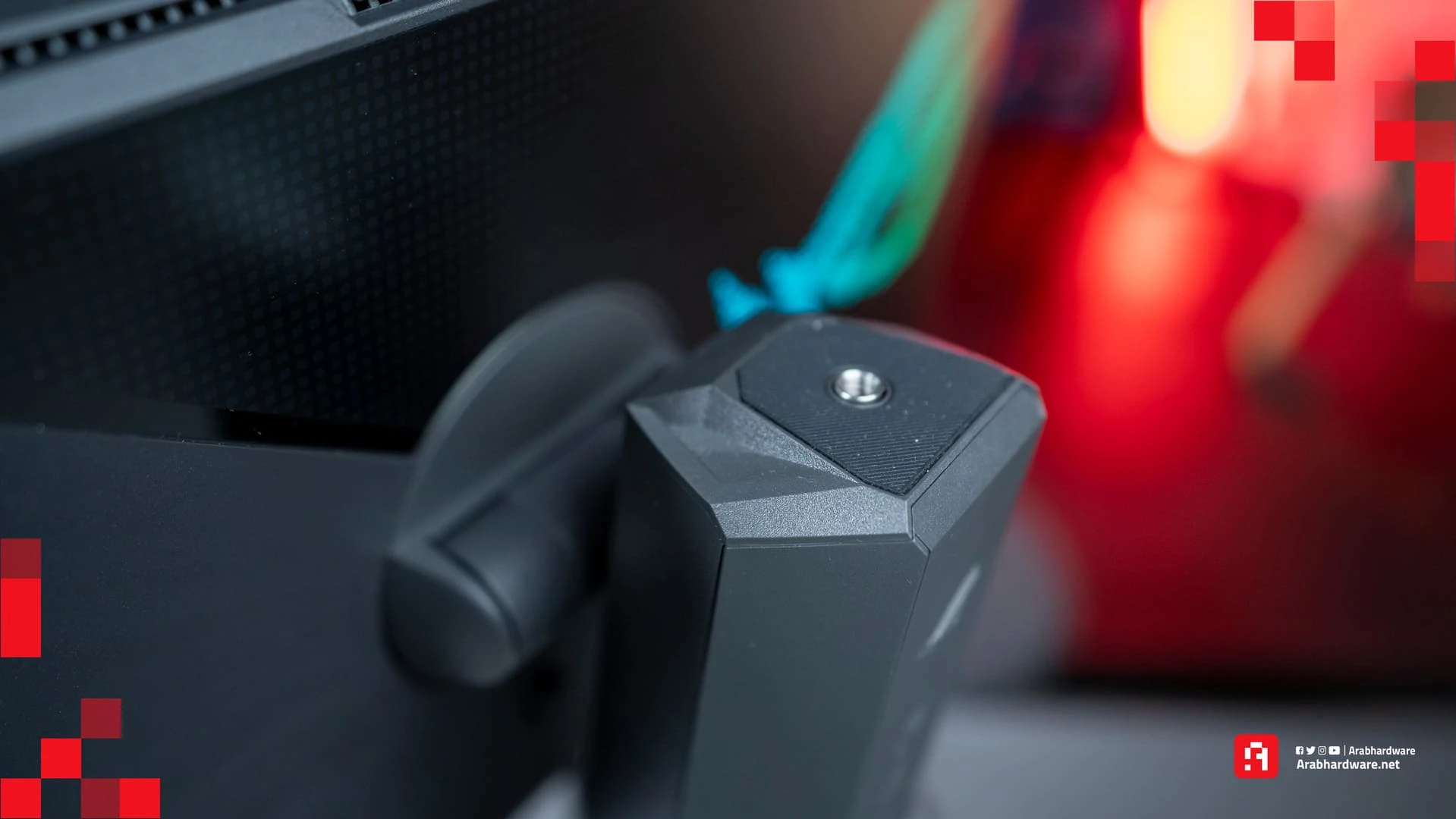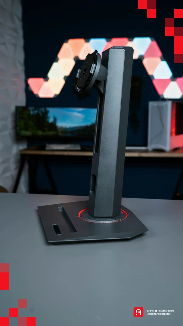 لكن للأسف لن تستطيع تدوير الشاشة أفقيًّا حول محورها بدرجة 90 درجة في حال استخدمت القاعدة المكتبية، حيث أن الارتفاع المُنخفض للحامل غير كافٍ لهذا الأمر؛ وستجد أن الشاشة تصطدم بالقاعدة.؛ وهو ما يجعل الطريقة الوحيدة لتدوير الشاشة بالكامل هو حامل VESA على الحائط. وهناك أيضًا فتحة في مُنتصف حامل الشاشة، تسمح بإمرار وتنظيم الكابلات بشكلٍ أفضل.