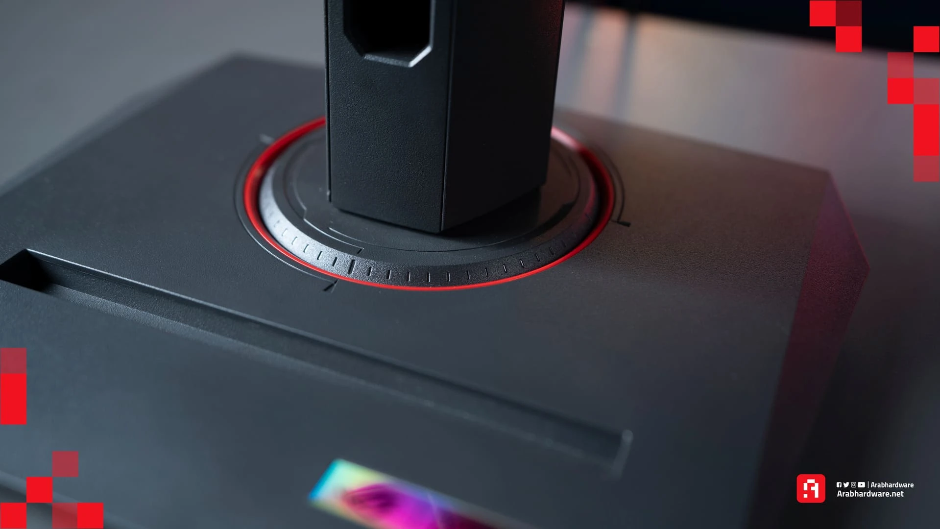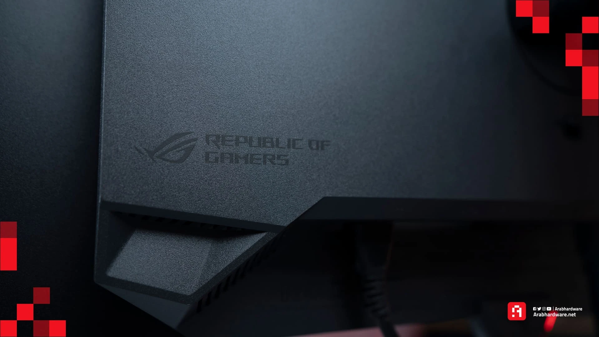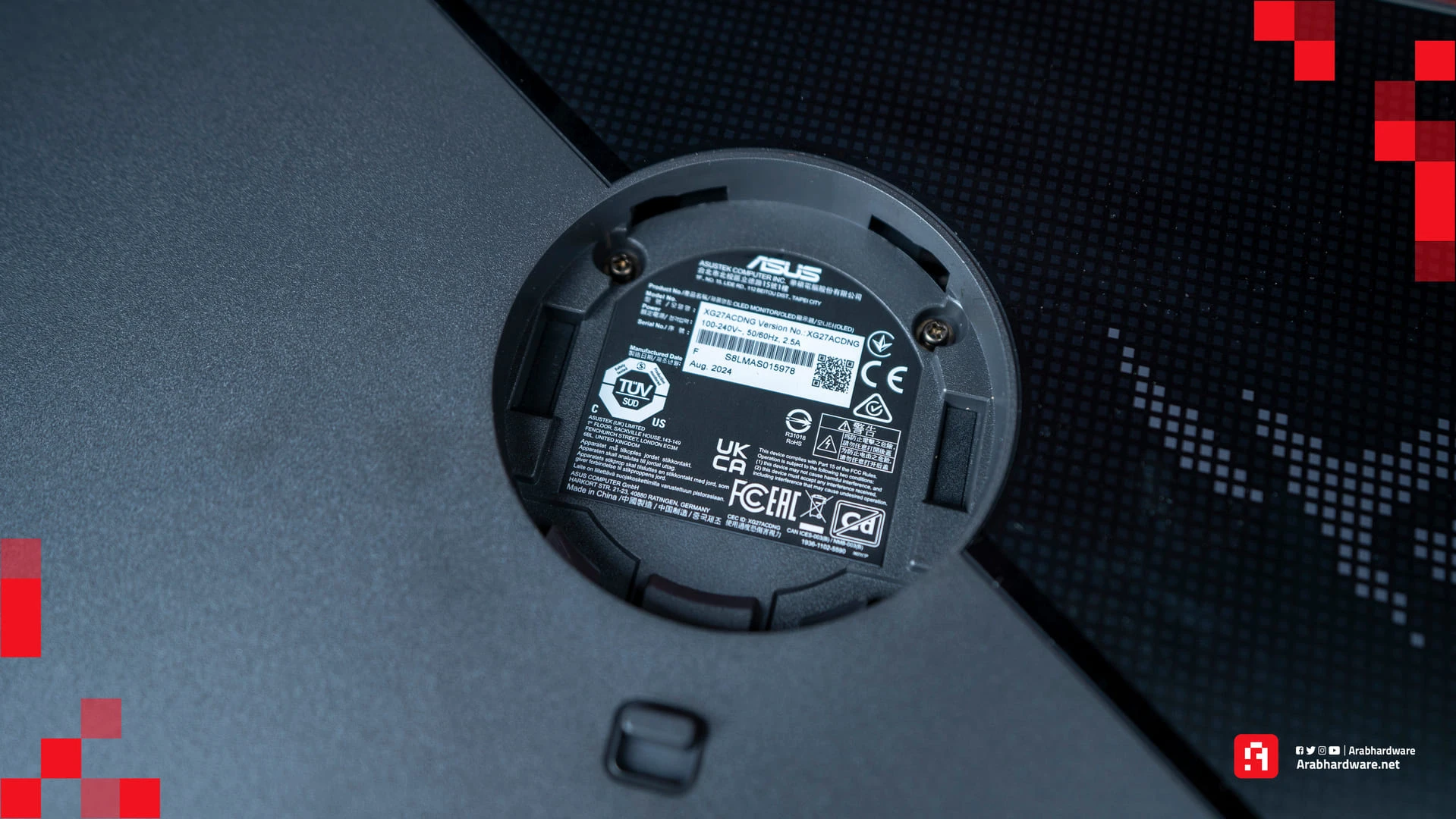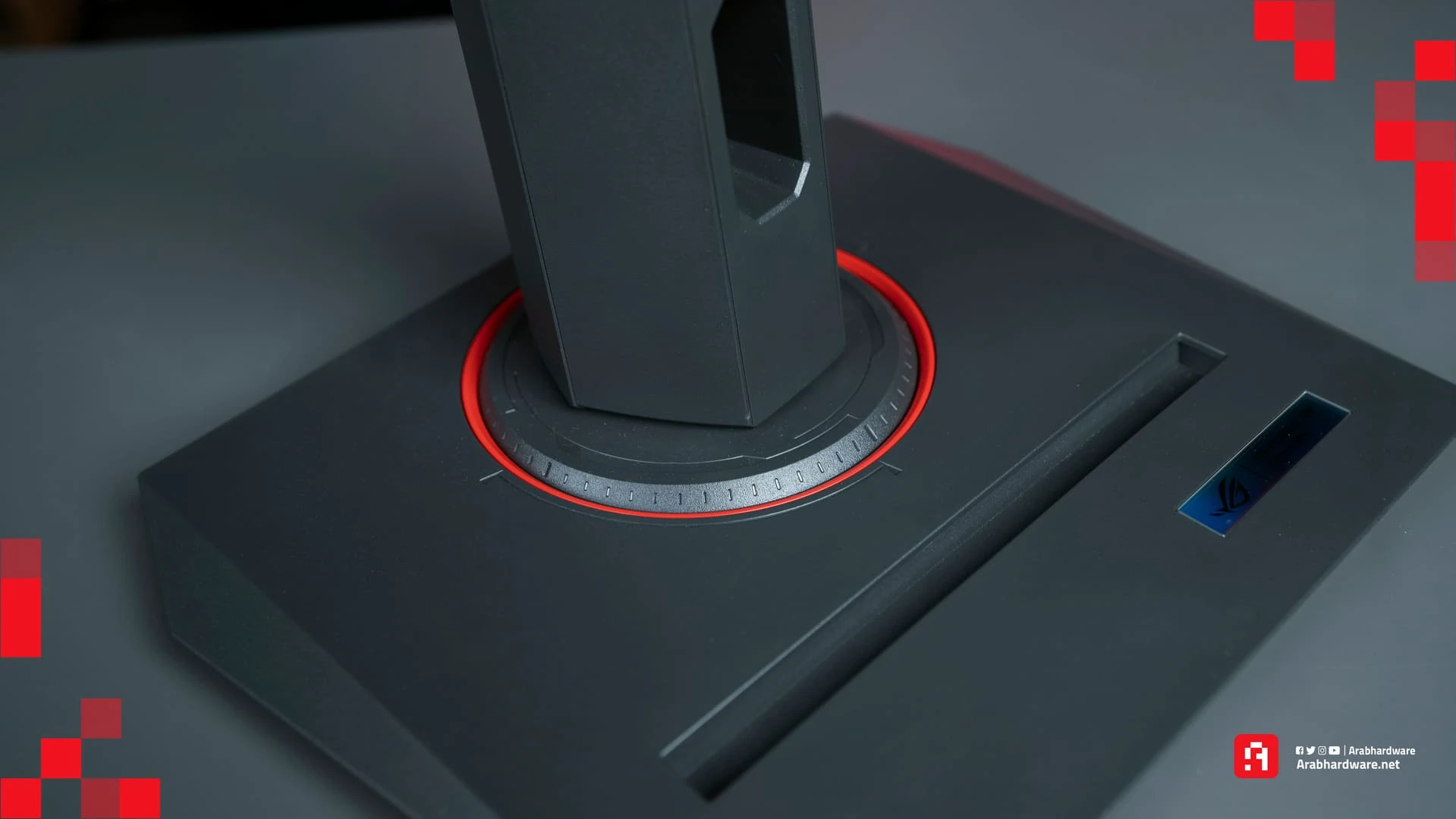 القاعدة البلاستيكية الخاصة بالشاشة لا تشغل هي الأُخرى الكثير من المساحة، ولكنها بالرغم من ذلك تُبقي شاشتك ثابتة في مكانها بدون أدنى مُشكلة بفضل القواعد المطّاطية الممتازة. هذا بالإضافة لوجود خندق بسيط في القاعدة يُمكنك وضع هاتفك المحمول بداخله؛ وحوله ستجد أيضًا مجموعة من المُلصقات البسيطة التي توضّح دعم الشاشة لتقنية G-Sync، وكونها ضمن سلسلة ROG.