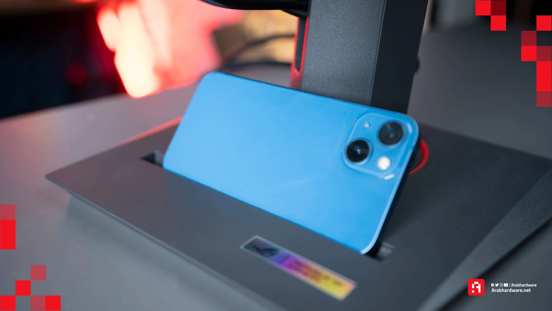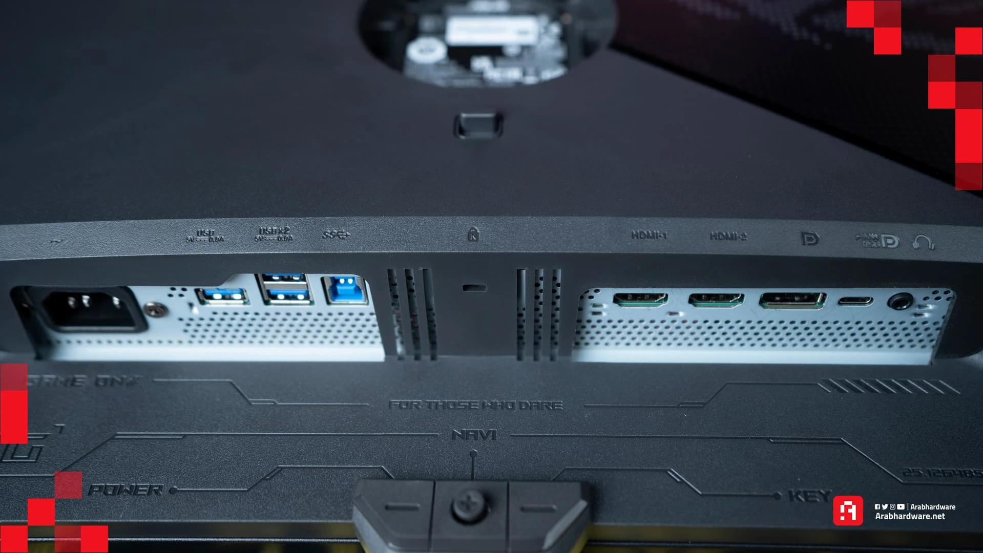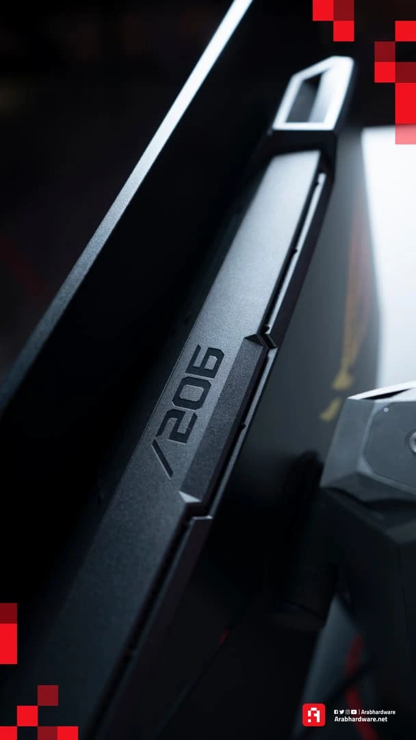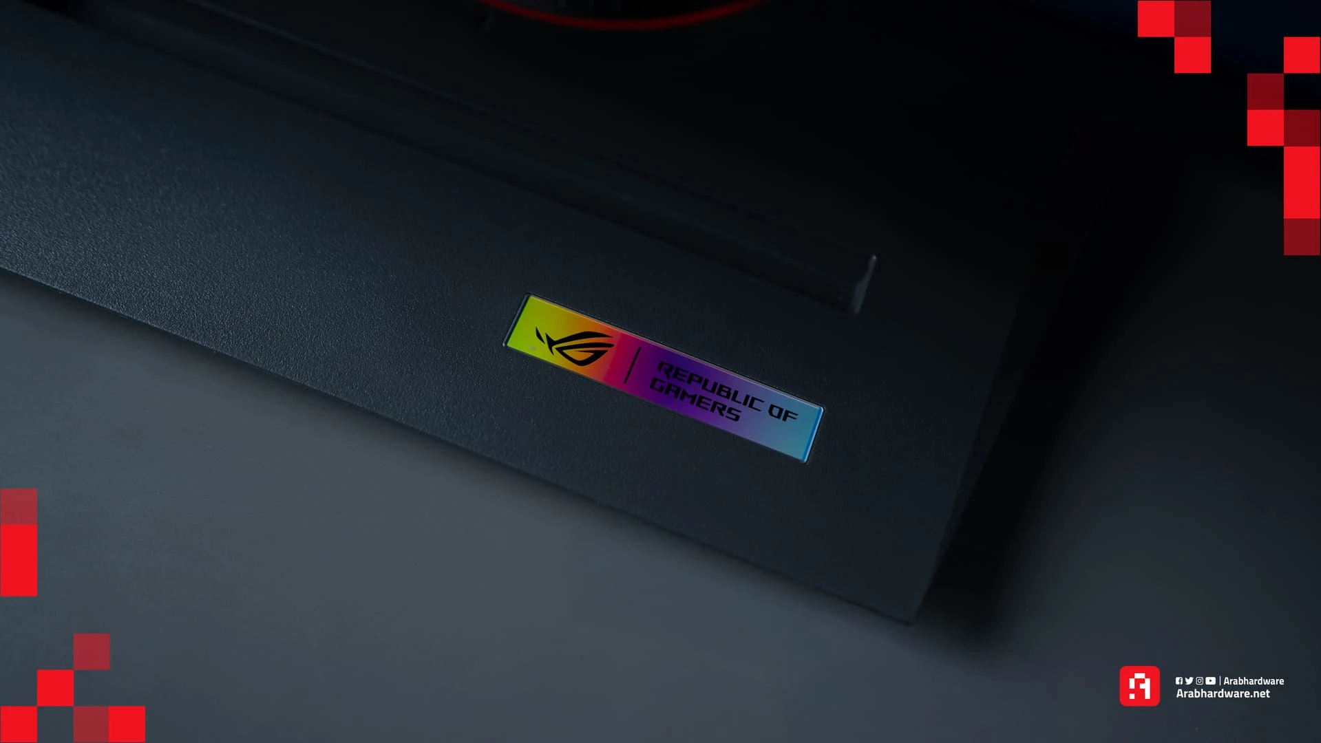 القاعدة البلاستيكية الخاصة بالشاشة لا تشغل هي الأُخرى الكثير من المساحة، ولكنها بالرغم من ذلك تُبقي شاشتك ثابتة في مكانها بدون أدنى مُشكلة بفضل القواعد المطّاطية الممتازة. هذا بالإضافة لوجود خندق بسيط في القاعدة يُمكنك وضع هاتفك المحمول بداخله؛ وحوله ستجد أيضًا مجموعة من المُلصقات البسيطة التي توضّح دعم الشاشة لتقنية G-Sync، وكونها ضمن سلسلة ROG.