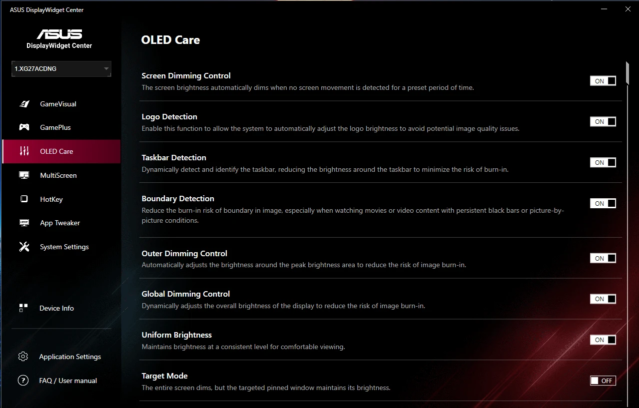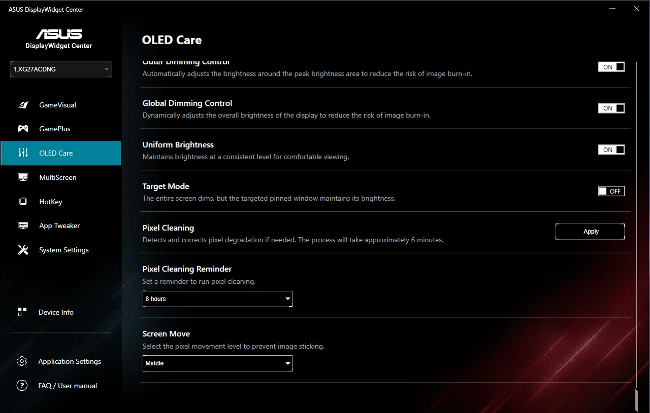 تقنيات ASUS OLED Care+: تدعم الشاشة أيضًا مجموعة من تقنيات الحماية المُتقدّمة التي تحتاج إليها لوحات OLED، مثل Pixel Cleaning و Screen Move، وغيرها من التقنيات التي تعمل على حماية الشاشة من احتراق البيكسلات، وإبقاء الصورة واضحة وساطعة في نفس الوقت بشكل تلقائي. جميع هذه الإعدادات يُمكنك التحكّم فيها من خلال تطبيق ASUS DisplayWidget Center.