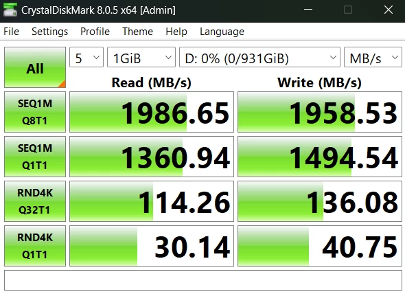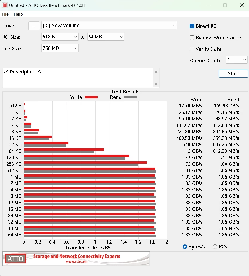 أما بالنسبة لاختبارات القراءة والكتابة الطبيعية، فالوحدة سجلت 1.98 جيجابايت لقراءة البيانات و1.95 جيجابايت لكتابتها مع اختبارات Crystal DiskMark. أما بالنسبة لاختبارات ATTO، والتي تعمل بمنهج مختلف عن Crystal DiskMark، فالسرعة التي وصلت لها كانت 1.85 جيجابايت للقراءة و1.83 جيجابايت للكتابة.