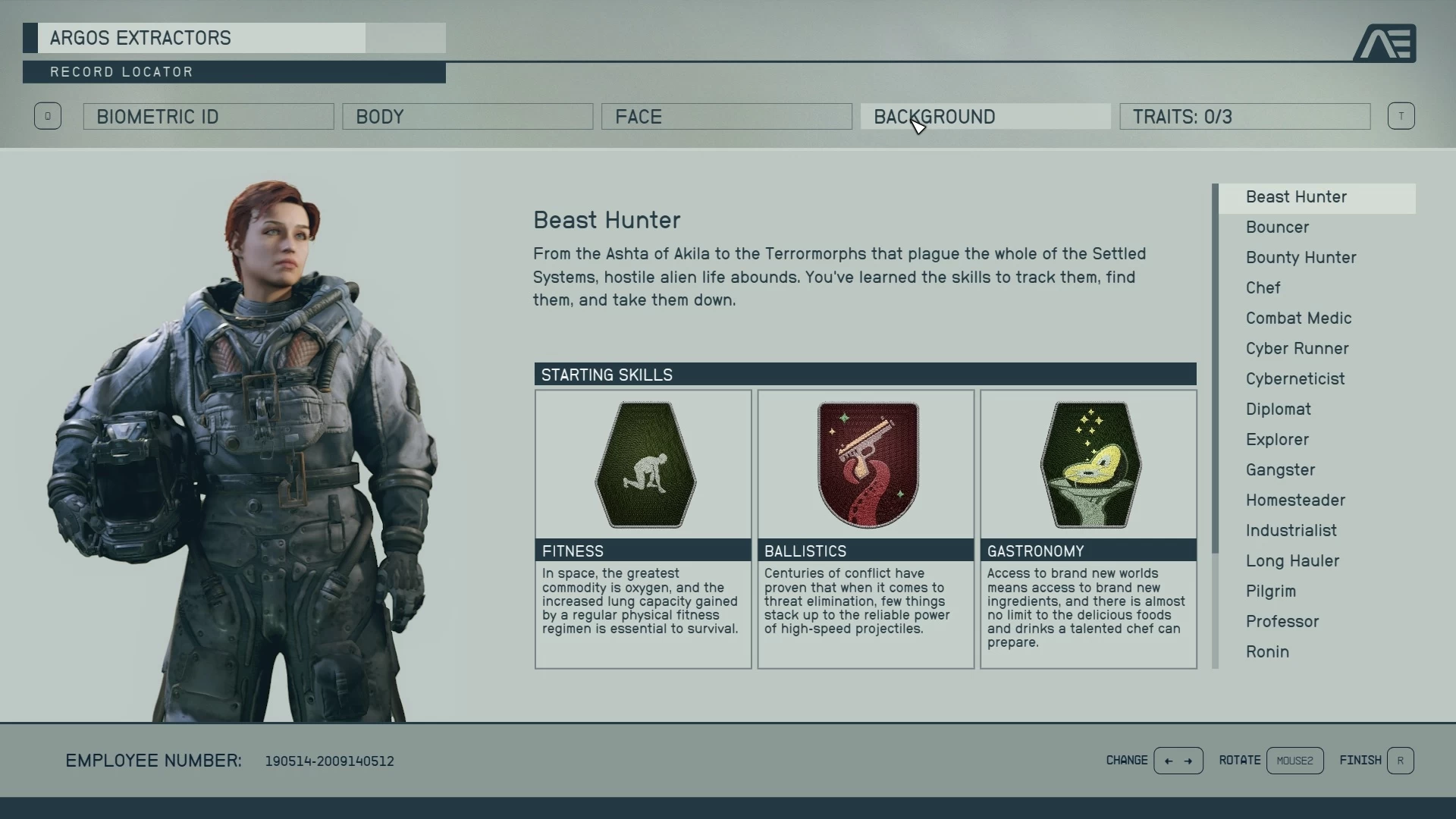 مثل أي لعبة تقمص أدوار، فستبدأ رحلتك في عالم Starfield وأنت تصنع شخصيتك ويمكنك تخصيصها واختيار الجنس والشكل وكل شيء، والتخصيص هنا هو الأعمق في تاريخ الاستوديو مما يسمح لك بصُنع شخصية أحلامك حتى لو أردت صُنع نفسك داخل اللعبة فستتمكن من فعل ذلك. ستختار أيضًا سمات الشخصية وتاريخها والذي يكون له تأثير في بعض المهام وبعض المواقف ويُكسبك مهارات مُعينة من بداية اللعبة، وشخصيًا اخترت أن أكون Bounty Hunter والذي كان له دورًا كبيرًا في أحد المهام الجانبية الأكثر روعة باللعبة.