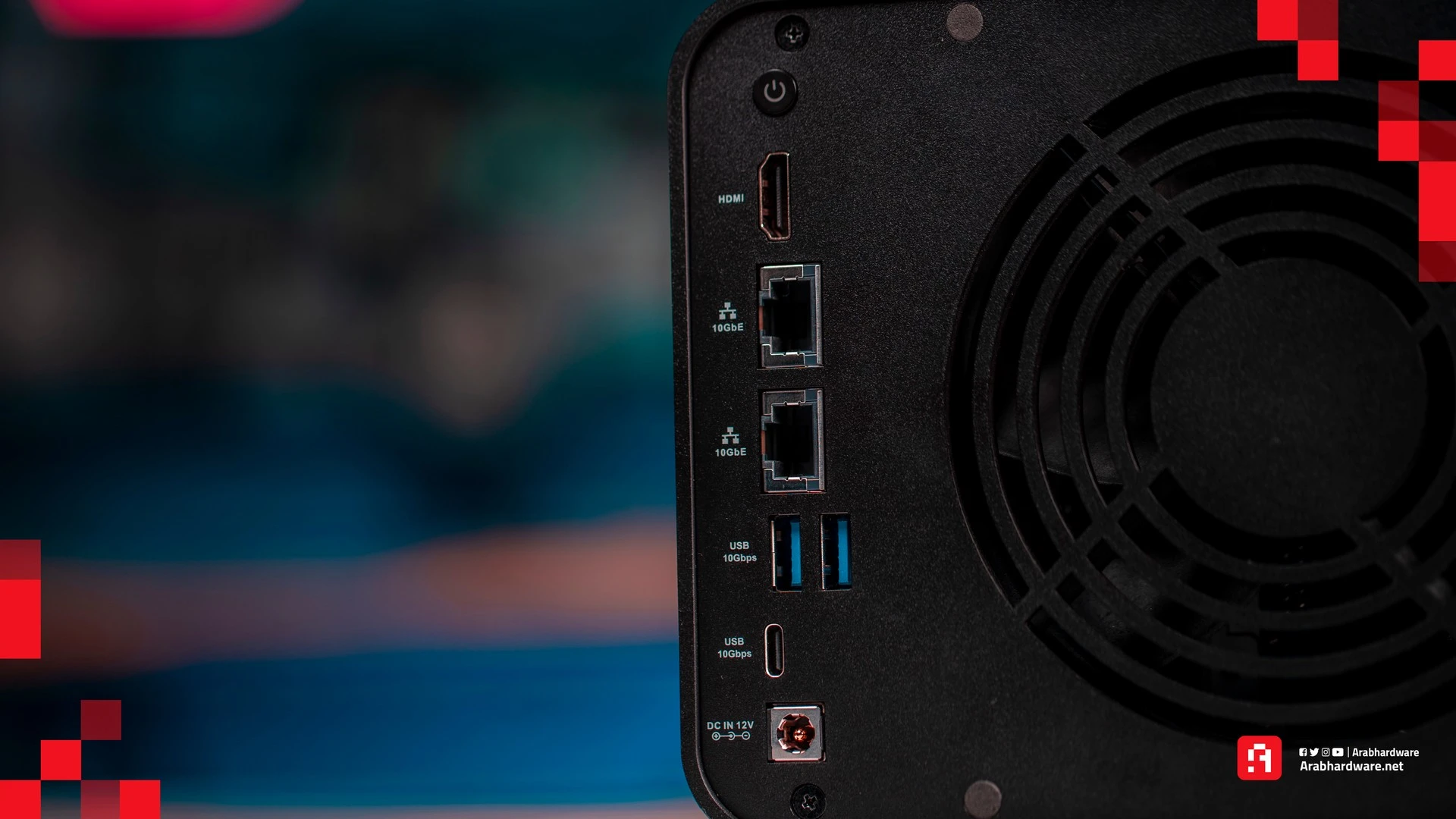 أما بالنسبة للتوصيلات، وهذا ما يهمنا أكثر بصراحة، فالتشكيلة التي يعتمد عليها الجهاز مذهلة. هناك منفذين USB 3.2، واحد من فئة Type-C والأخرى من Type-A، والسرعة القصوى للثنائي هي 10 جيجابت في الثانية الواحدة. توصيلات جيدة جدًا بالنسبة للسعر حتى الآن، لكن ما يجعلها أفضل هي التوصيلات الشبكية. نتحدث هنا عن ثنائي الـ 10 جيجابت في الثانية الواحدة، والأقوى من هذا أنه يمكن ربط الثنائي لتحصل على سرعة تصل إلى 20 جيجابت في الثانية الواحدة. رقم مذهل بالنسبة للشبكات، وبالتأكيد ستحتاج إلى شبكة قوية تقدم هذه السرعات لتستغل ثنائي المنافذ هذا.