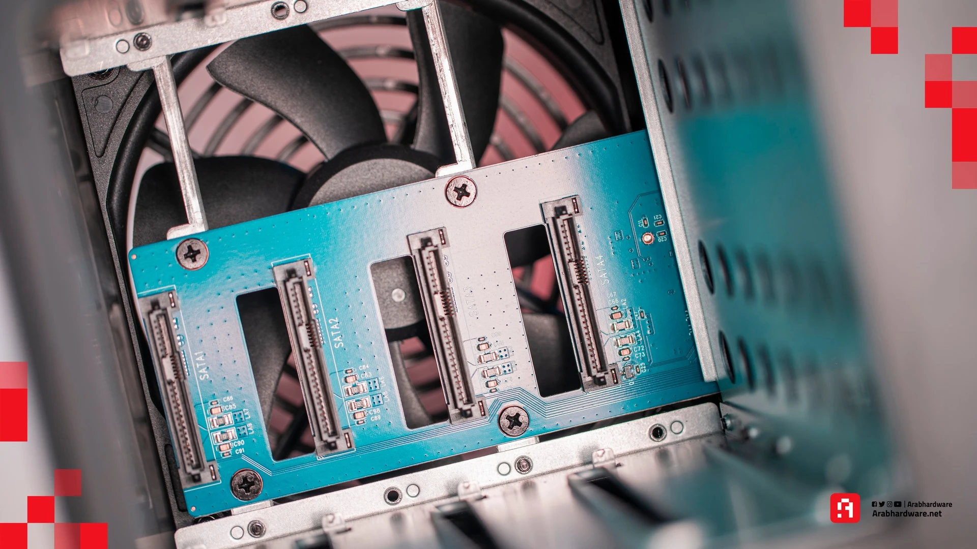 - مساحات تركيب وحدات التخزين: أربع مساحات للهارد ديسك ومنفذين للـ NVMe SSD من الجيل الرابع.