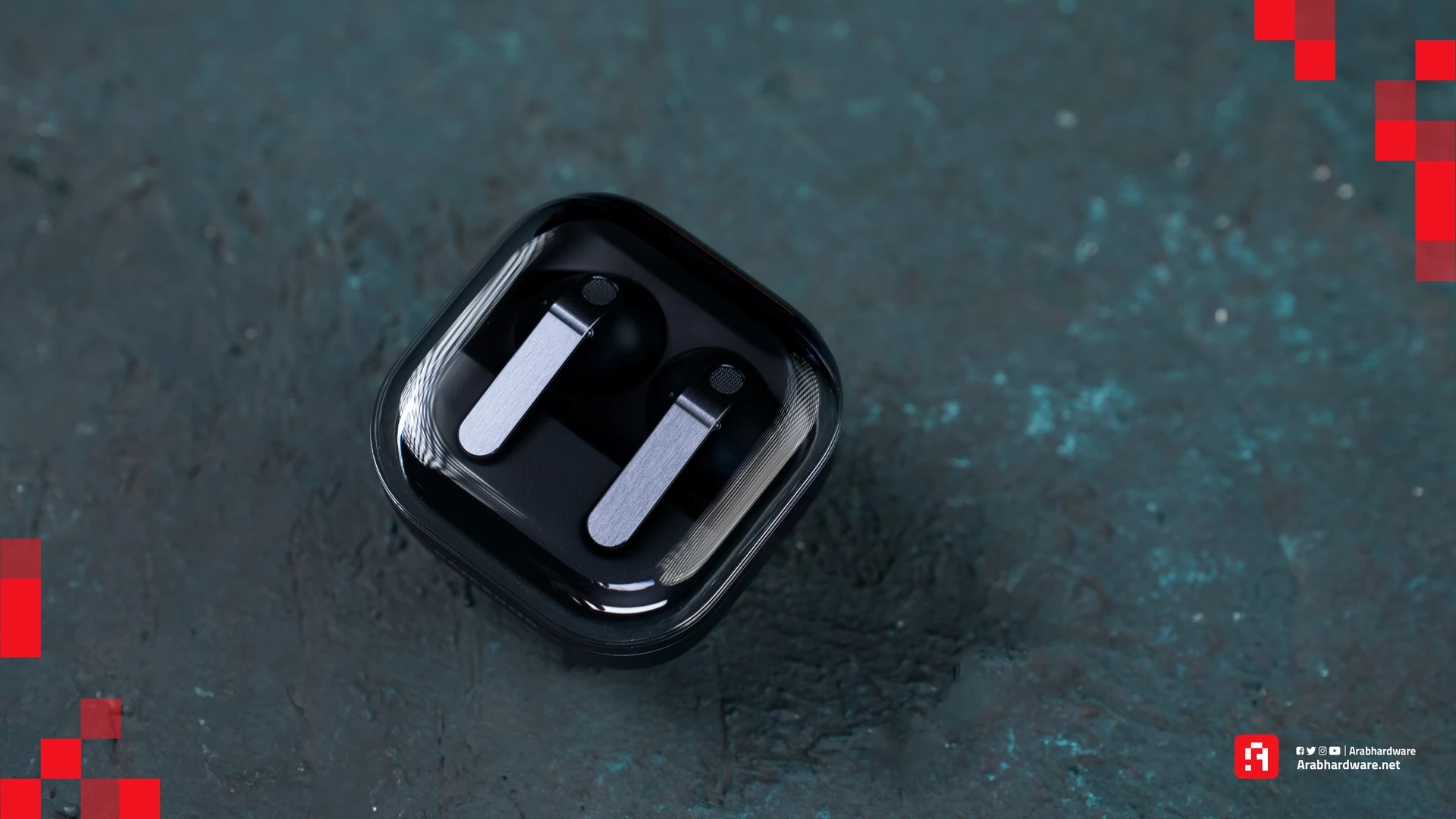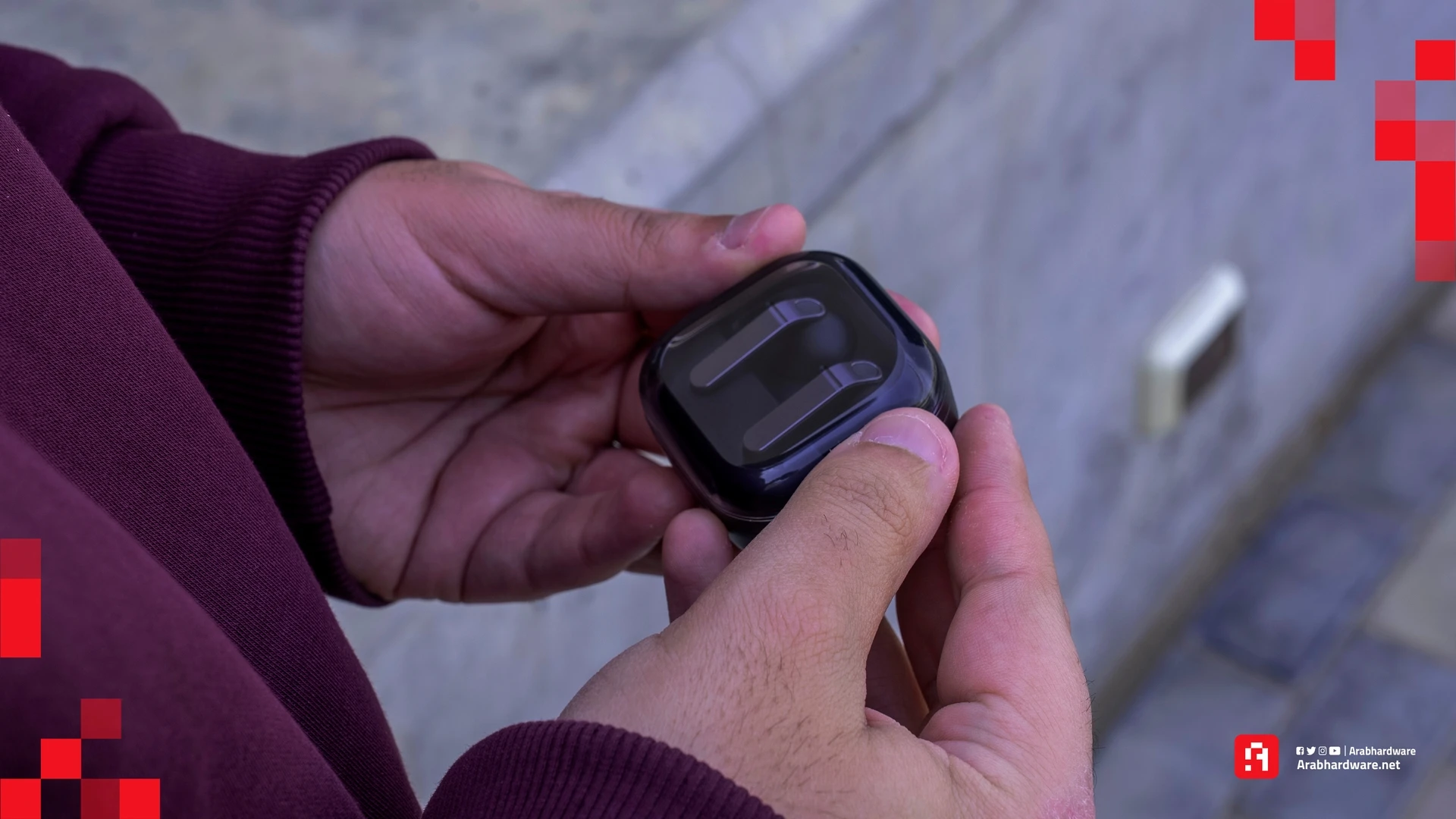 حافظة الشحن حافظت على الغطاء العلوي الشفاف بتصميم صدفي مدمج يسهل وضعه في أصغر الجيوب. السماعات تستقر أفقيا داخل العلبة وتتصل بنقاط الشحن عبر الساق المعدنية بفعالية تامة.