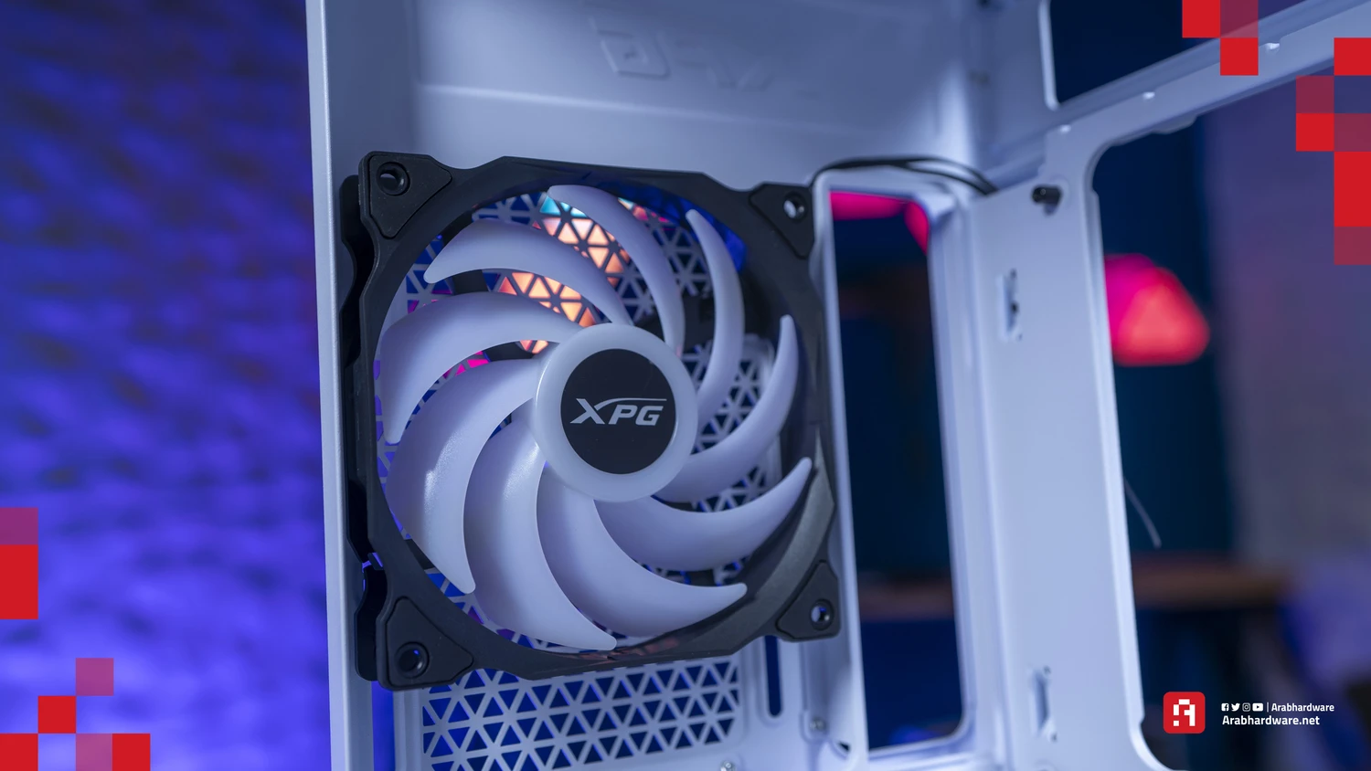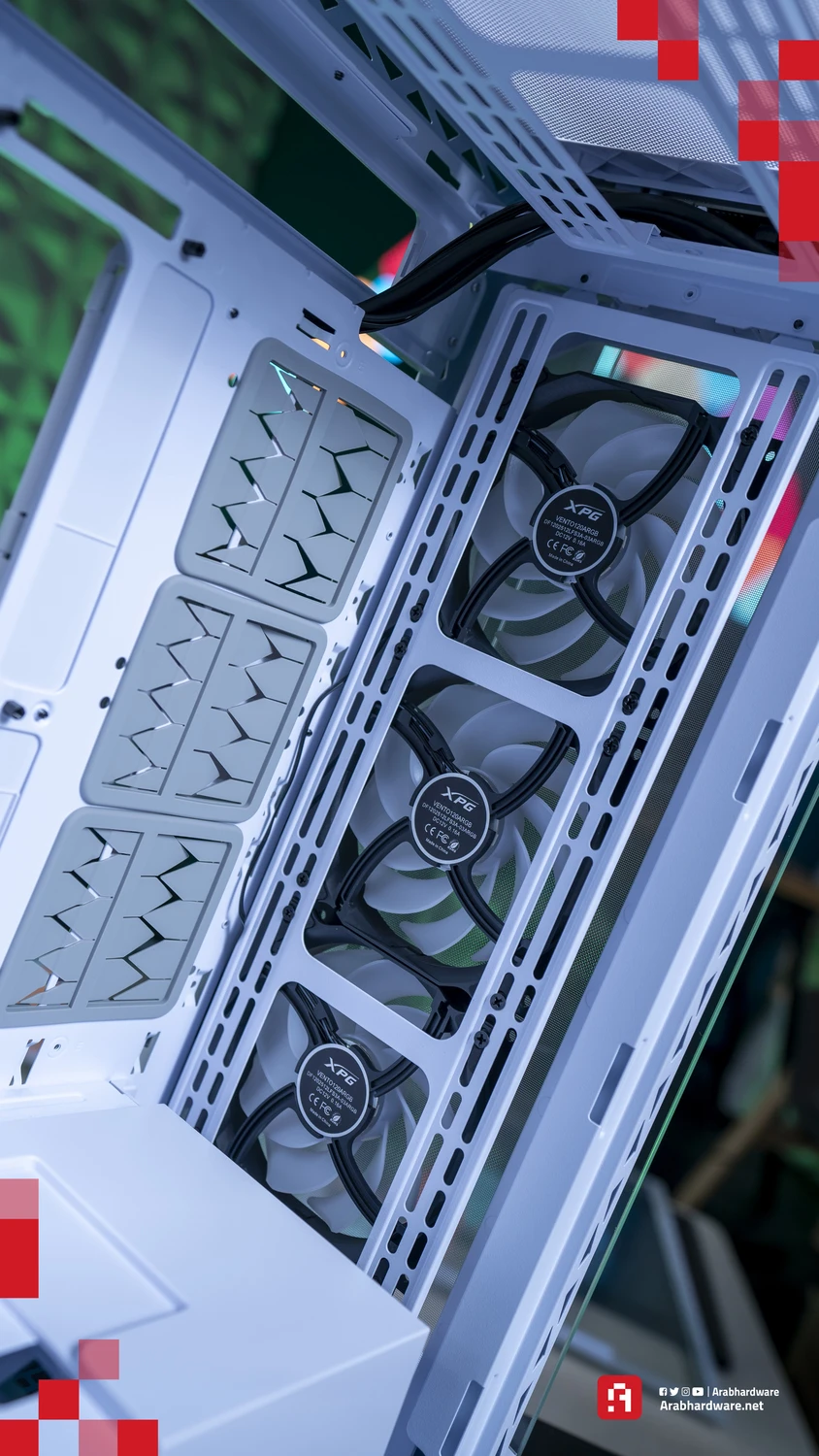 بالحديث عن التهوية والتبريد، فالكيس تضم 4 مراوح ARGB مُثبتة مُسبقًا تصل سرعتها إلى 1200 دورة في الدقيقة، وتدفق هواء يصل إلى 45.3 CFM. يُمكن التحكم في سرعة المراوح وإضاءتها بأكثر من طريقة (لا حاجةَ للوحة أم متوافقة لوجود جهاز XRP Prime Box)، وإذا كنت تتساءل عن تعامل الكيس مع الأتربة، فالـ XPG Battlecruiser II تحتمي بـ 3 مرشحات للغبار، من الأمام والأعلى والأسفل، بمسامٍ ضيقة لمنع الأتربة قدر المستطاع. شيء آخر نلاحظه في تصميم هذه الكيس أنها تتسع لجميع أنواع اللوحات الأم وجميع كروت الشاشة التي قد تفكر فيها، خاصةً وأنها تأتي بجميع أدوات لتثبيت.