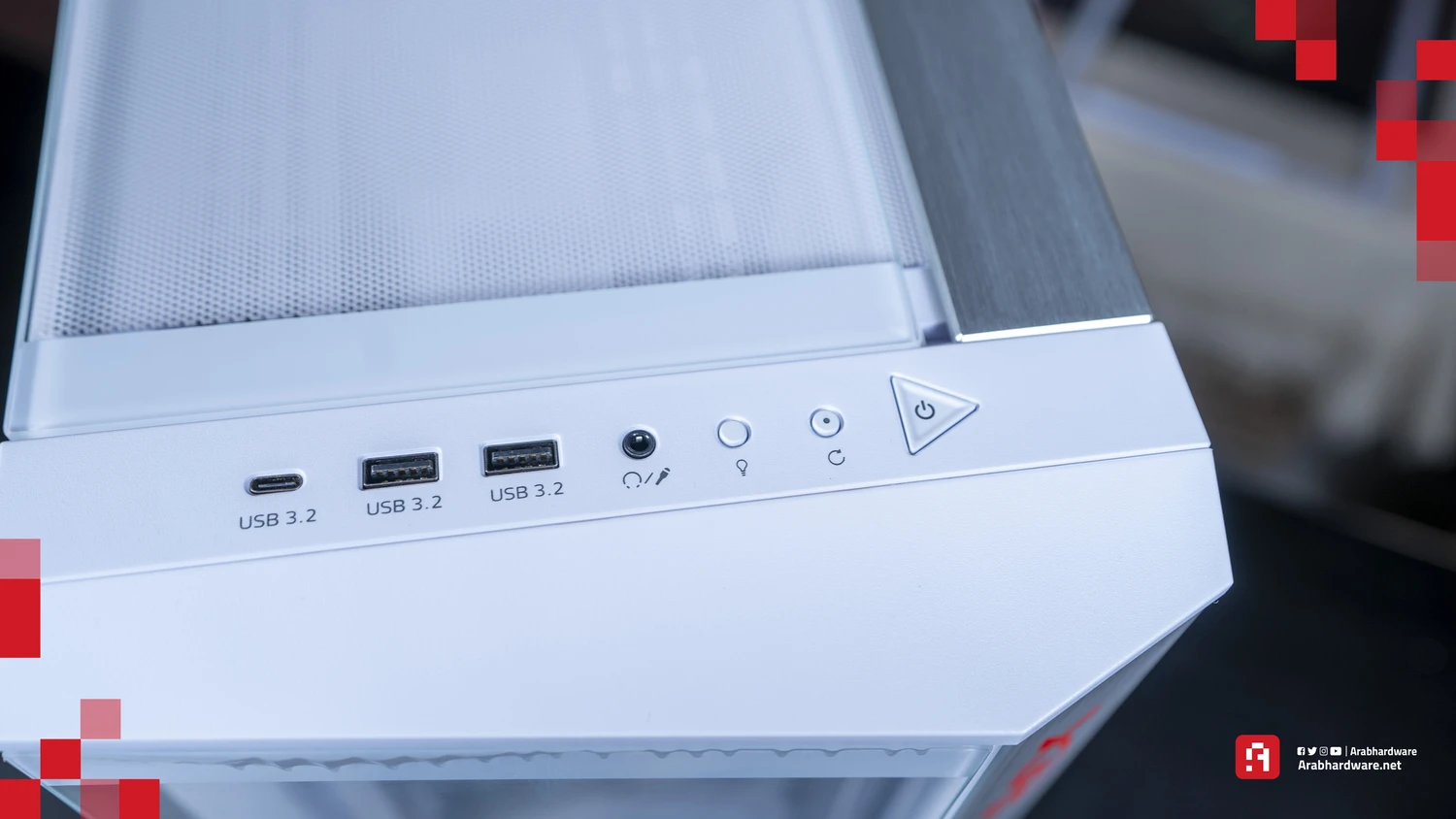 المنافذ: في الجزء العلوي الأمامي من الكيس، بجانب مفتاح التشغيل و"الريستارت" وتغيير إضاءات الـ RGB، ستجد منفذ الـ 3.5 ملم الخاص بالصوت وبجواره منفذين USB 3.2 Type-A وآخر USB 3.2 Gen 2 Type-C بسرعة تصل إلى 20 جيجابايت/ ثانية.